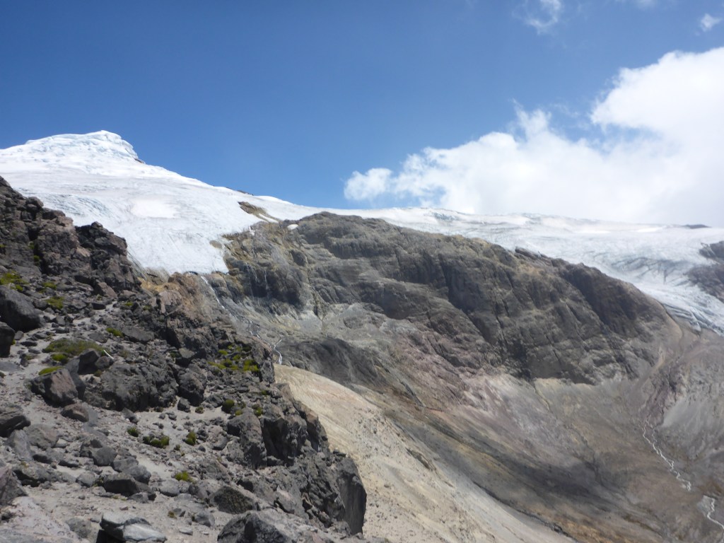 A Belgian woman sits nearby with her Ecuadorian guide. Ossy tells us they attempted a summit last night — in what looked like perfect conditions — but turned back at the glacier after hearing loud, ominous cracking caused by a condition Ecuadorians call superficial tension. Temperature differentials create unstable fractures, which in a worst case can trigger ice avalanches. They had no choice but to retreat a few hours into their attempt.