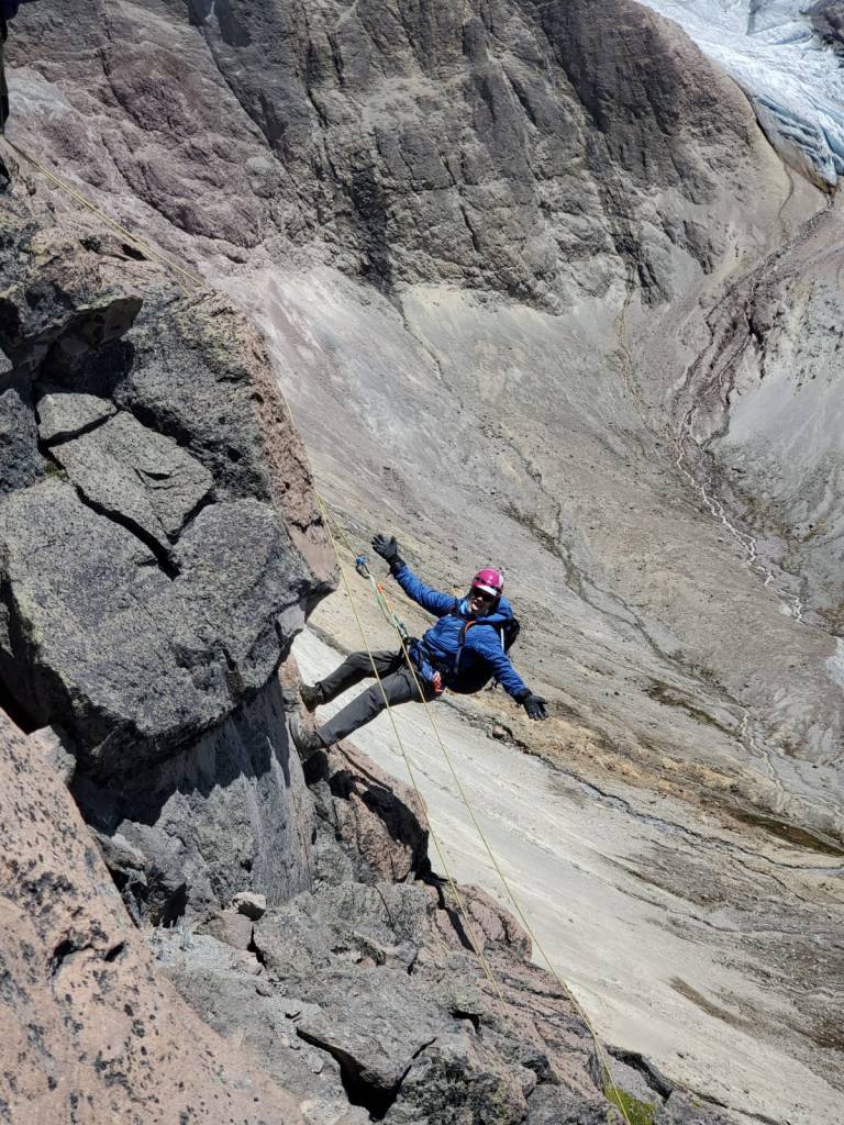 After lunch we return to the rock to practice crevasse self-rescue using only a two-prusik system: one prusik attached to your harness, one to a foot loop. By alternating weight — slide foot prusik up while sitting back, then stand to slide the harness prusik — you can, slowly and with heroic effort, ratchet yourself up a fixed rope. Overhangs are brutal: the top prusik is pinned by your own weight and must be slid past a kink in the rope. At one such point, I simply abandon the foot prusik and free-climb while inching the top prusik upward to “bank” progress..