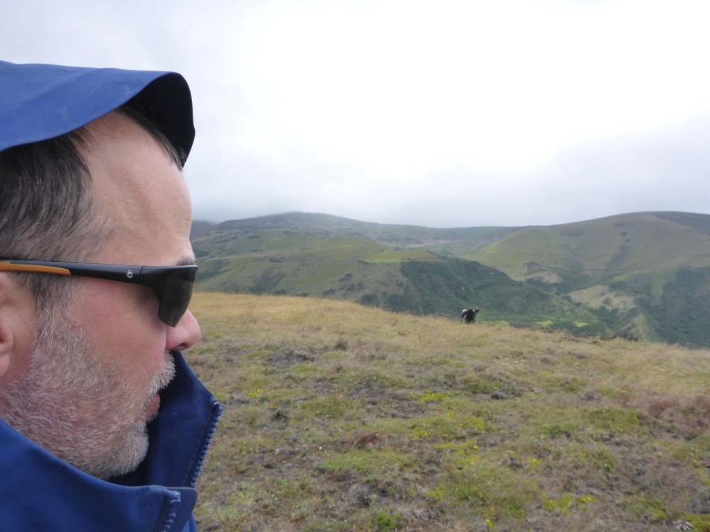 Like all my Ecuadorian “adventures,” the danger proves to be entirely in my head. We skirt the bull in a wide circle and cross another fence to a dirt road. The bushwhacking has lost its charm, so we follow the road past small farms balanced on impossibly steep slopes. The wind dies and the high-altitude sun starts poaching us inside our wind shells. I would have taken off my shell pants, but beneath them I am wearing multi-colored Burton knickers. Rather than go full clown, I roll the wind pants up over my knees, letting just the tips of the knickers peek out. I believe I look pfine to the llamas, cows, and the one truck of confused farmers who greet us with unearned warmth.