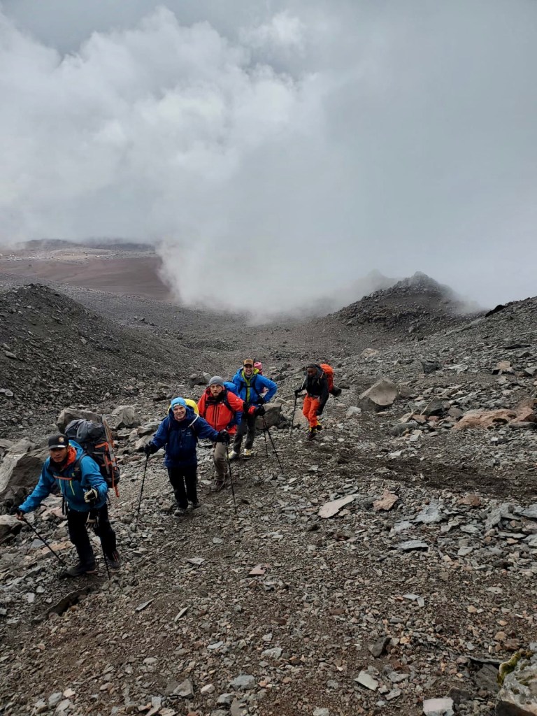 We head out at 8:30 am for a four-hour drive to Chimbo. We stop for lunch, but the drive otherwise passes quickly. At the park entrance we sign in at the guesthouse and then dodge potholes to the end of the road. It has been snowing, but is clear for the moment. Two porters meet us to haul extra gear, and we hit the trail for the high hut.