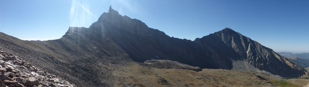 The trek to the saddle is a slow slog, bouldering across a few false saddles and losing birds’-eye visibility in the rolls and dips of the rocky terrain. I pause to consider whether the better line here is closer to Hyndman or Old Hyndman. Probably the former.