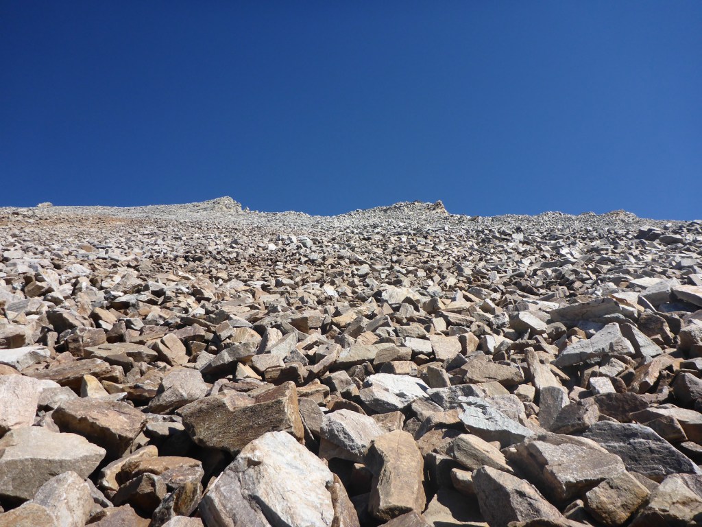 Quick word of advice about rock-fall on Hyndman: Trekking up Hyndman solo probably isn’t a great idea, because you could fairly easily twist an ankle or break a leg. But at least you don’t have to worry about a partner’s rock-fall. Best bet is to take the implicit advice I got from the Helpful Expert: go with a partner and stay out of each other’s fall line at all times.