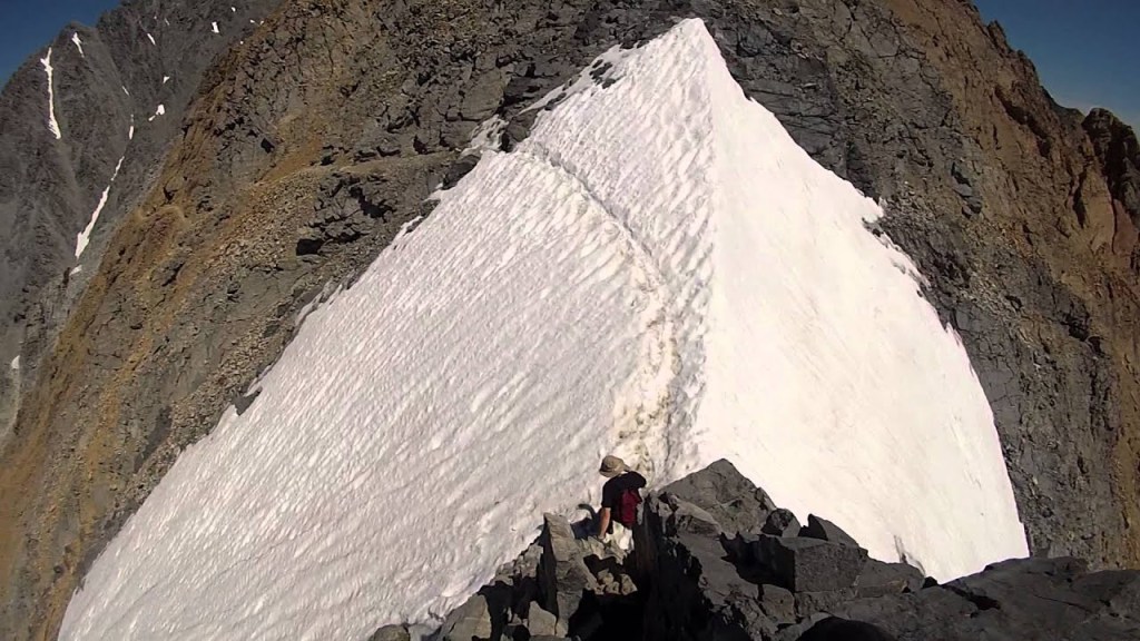 Back at the snow-bridge, I meet Gary, who crossed COR earlier with a SLR camera & big-ass lens dangling from his neck. I tell him I am contemplating the “go around” route, because I don’t really savor another helping of COR’s knife-edge. We watch three climbers struggle in the soft “go around” route. Gary declares COR safer; I’m unconvinced. While I consider my least-worst option, it begins to rain. Well, hail actually. A wet hail, that starts to dampen the rocks. Before I know it, Gary is climbing up the “down-climb” to COR. He isn’t waiting around for more rain, and I’m not going to be guideless. So I follow as quickly as I can.
