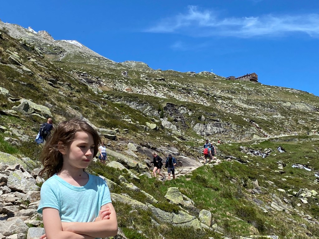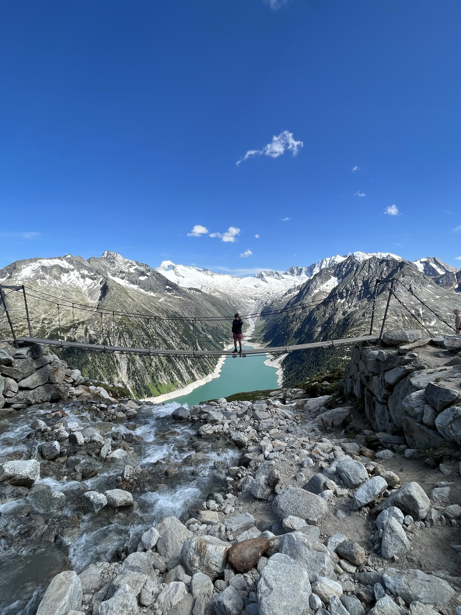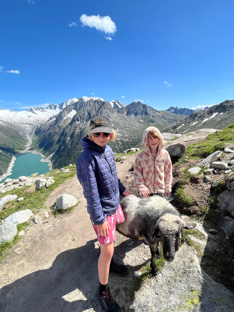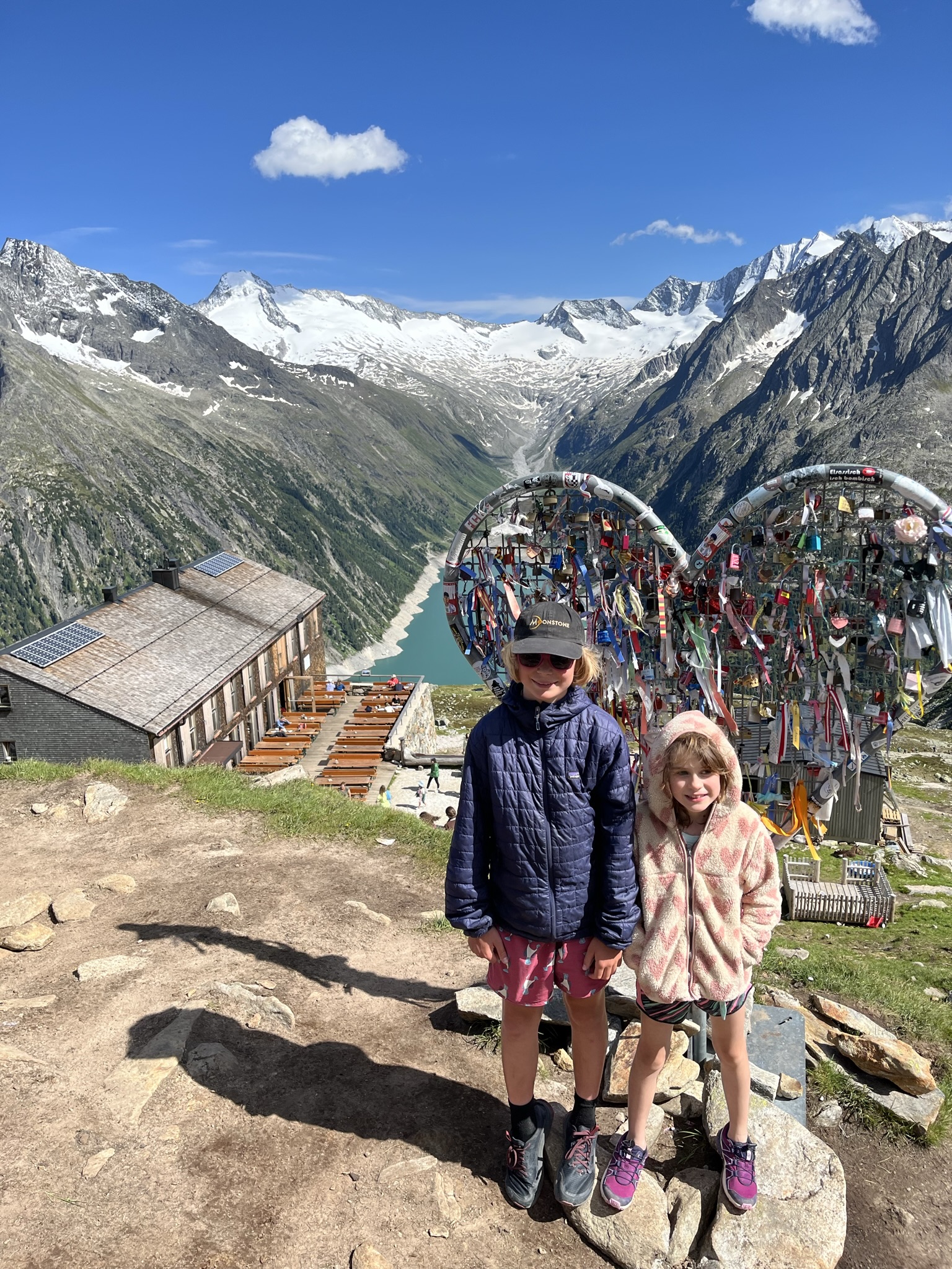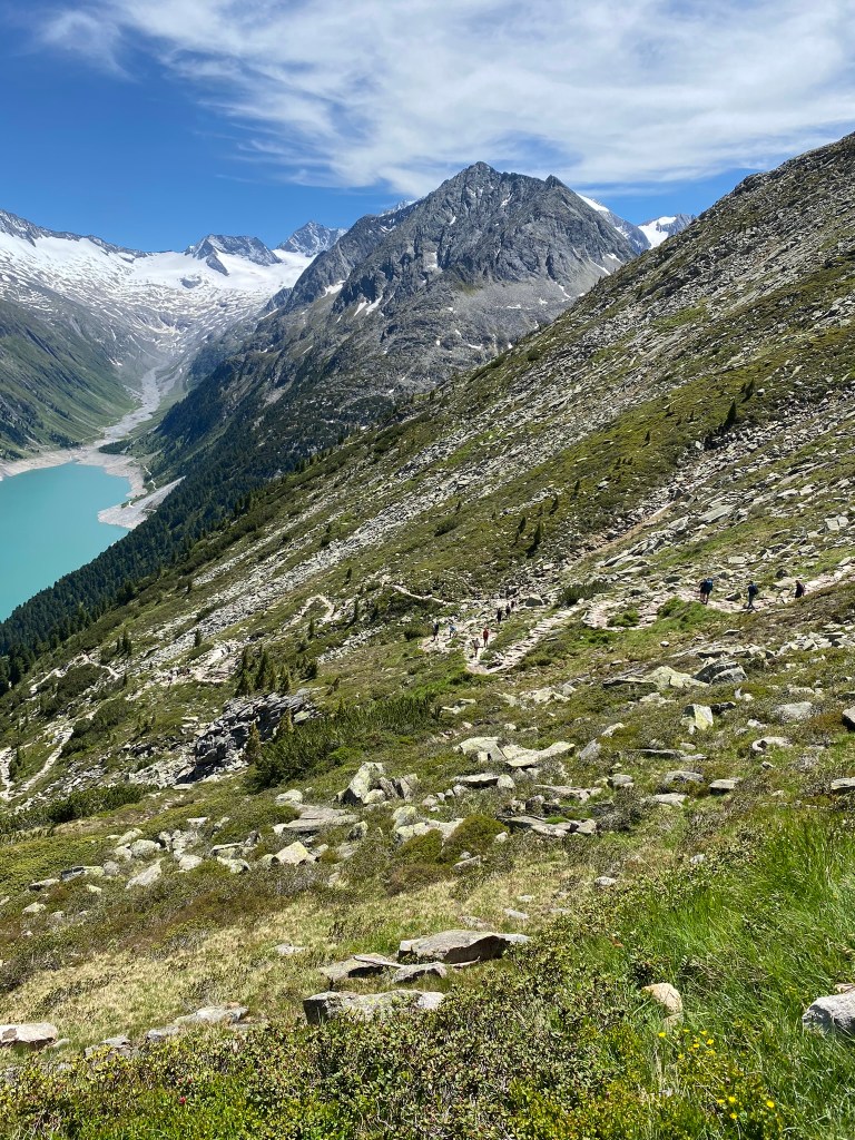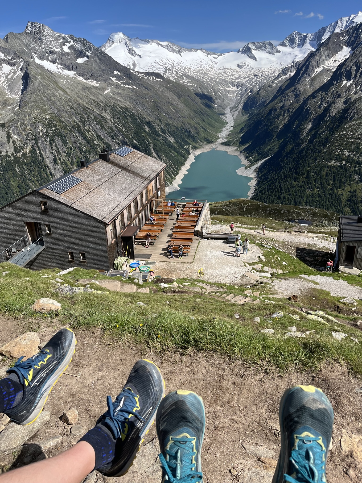 The next day, we head to Mayrhof for our trek to an overnight stay at the Olpererehutte. The final stretch of road is one-lane, alternating 15-minute windows of uphill and downhill traffic, monitored by a park employee who also controls parking-lot capacity. She informs us that we are the last car allowed in today — had we arrived 15 minutes later, we’d be banished. Many cars settle for illegal parking in a narrow construction zone, but we luck into a legitimate spot.